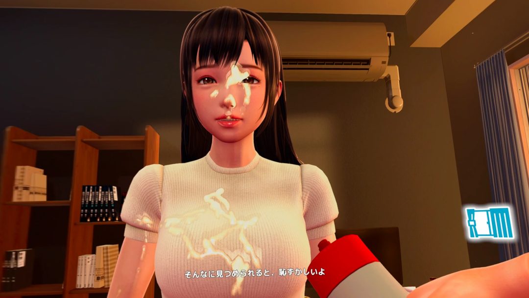 射精は右コントローラーのトリガーを引いてジョイスティックを倒すことで可能。顔に精子がかかる表現がリアルで、液体物理演算の進化を感じます。